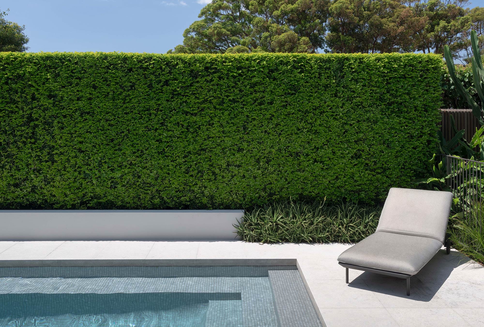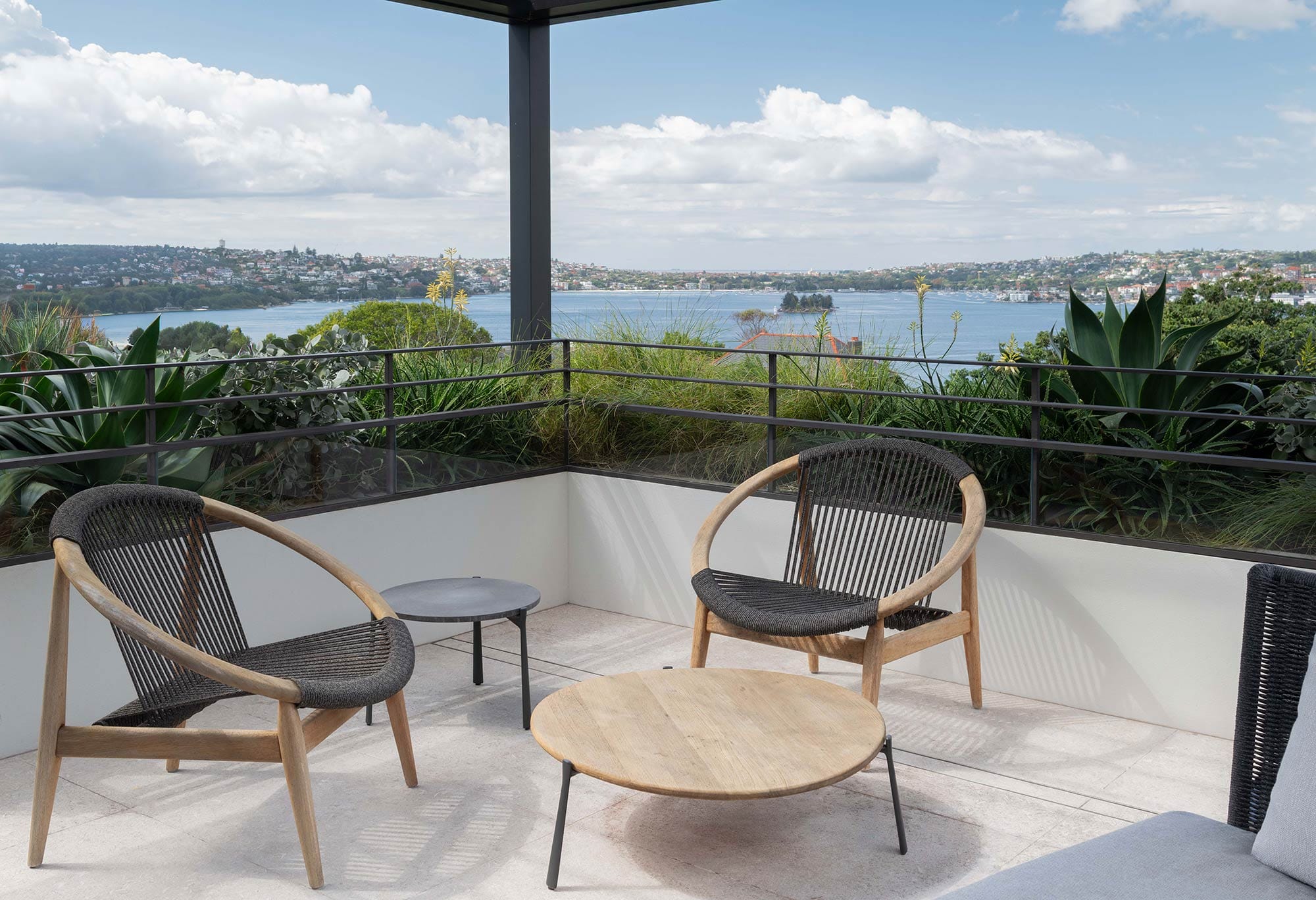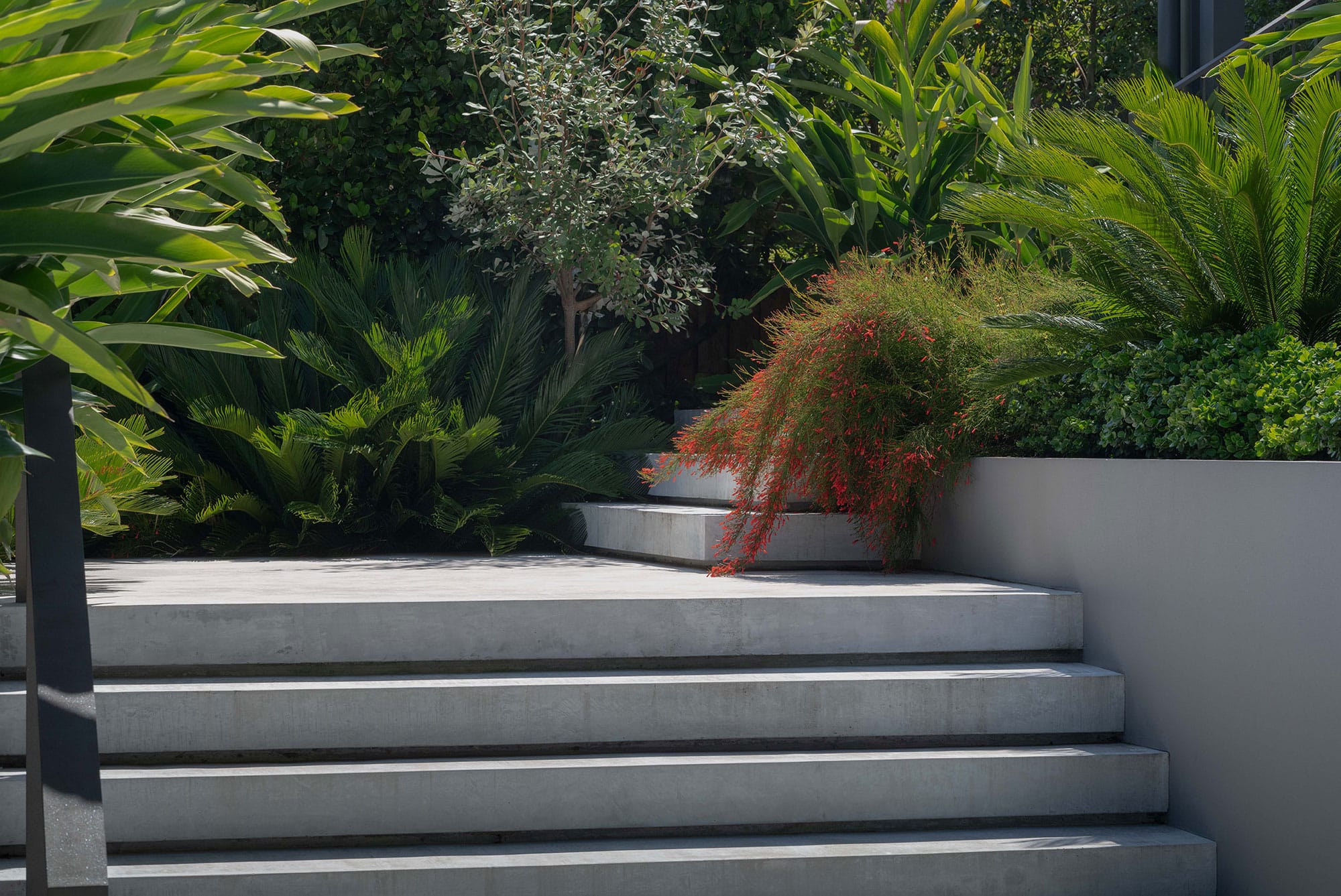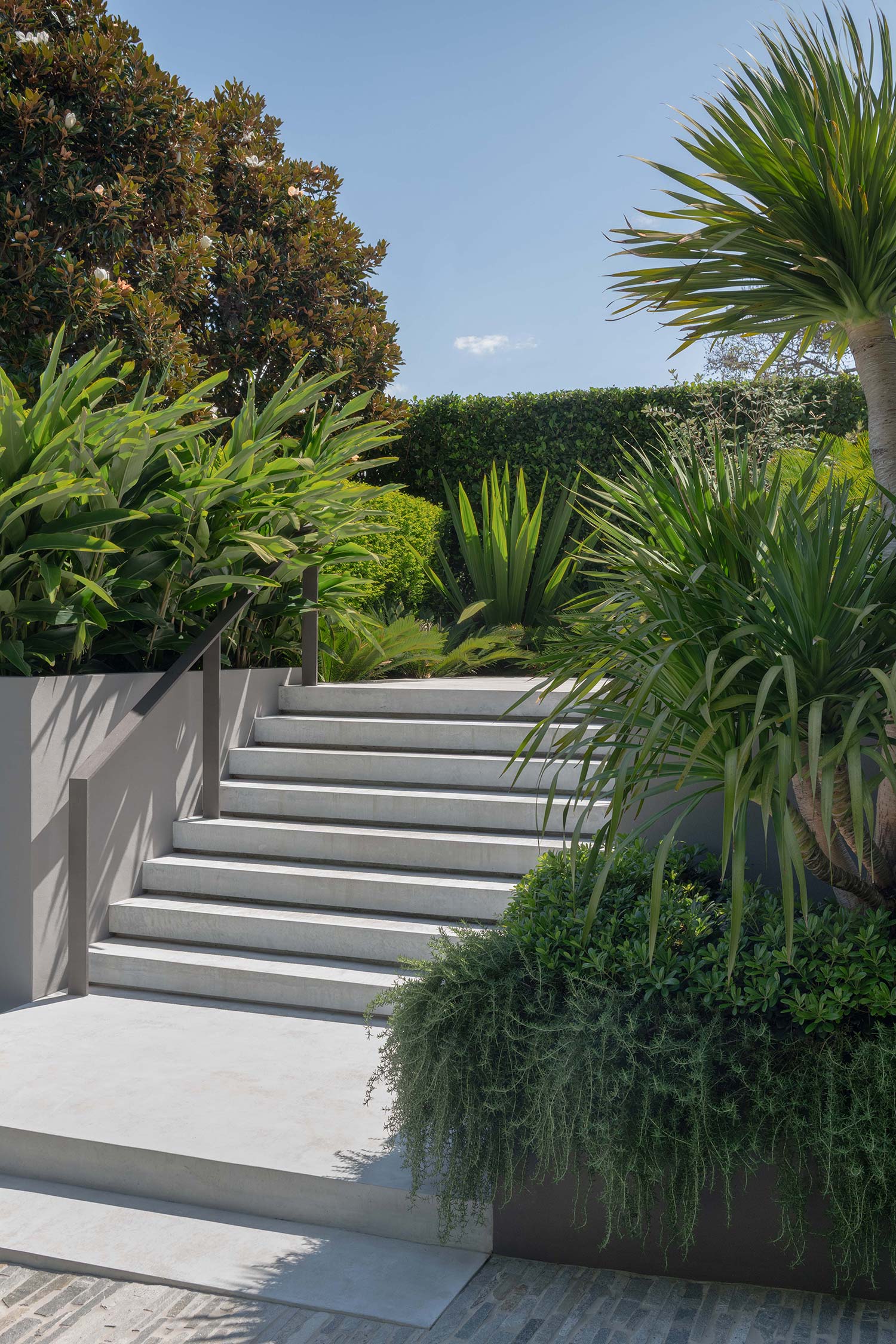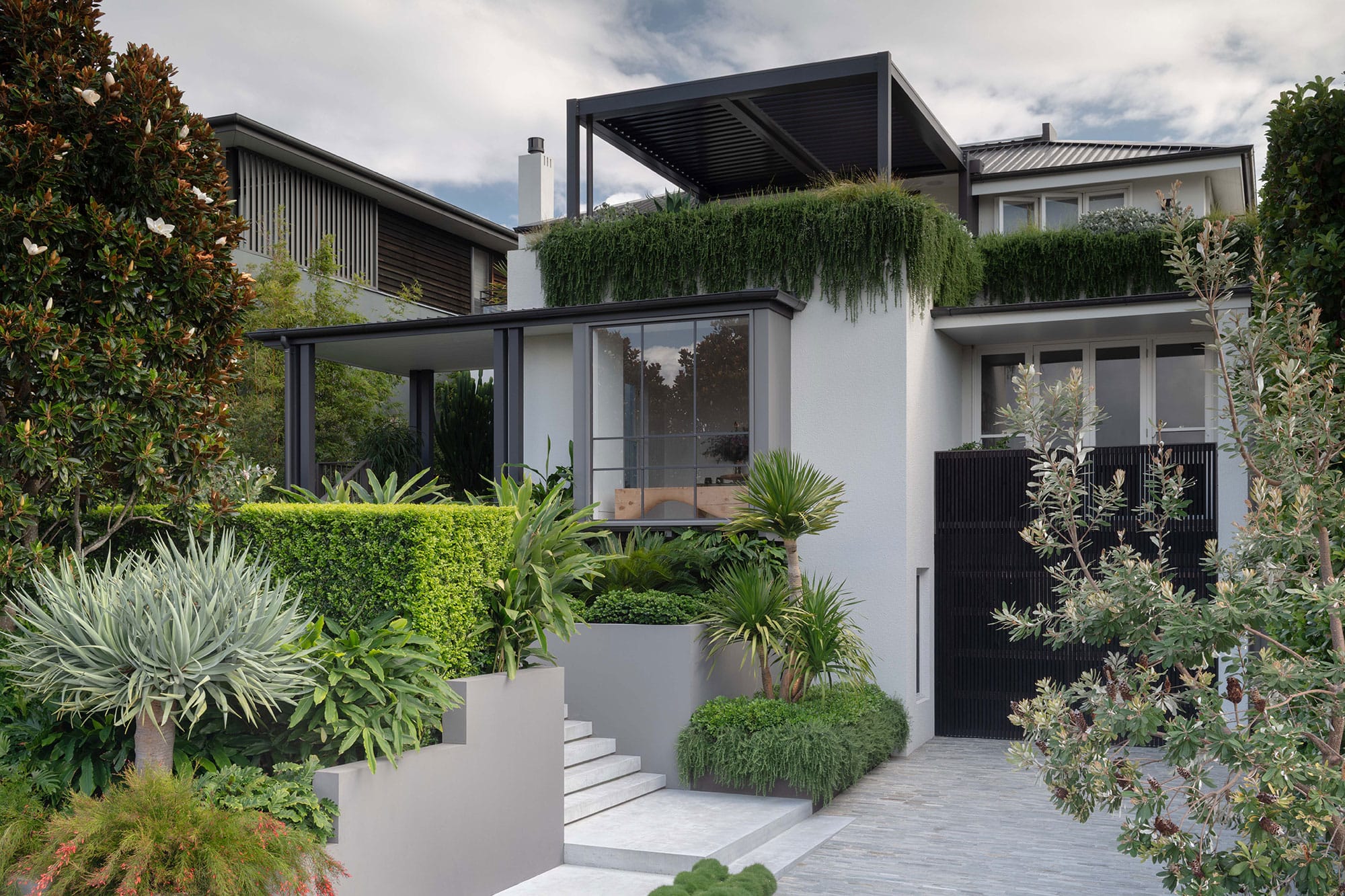 Planting was carefully considered to balance softness with structure, combining loose, textural foliage with strong architectural elements to complement the built form and the established hedges. From the rooftop, framed views extend across Taylors Bay, anchoring the home within its coastal context.
